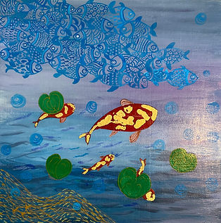 Dancing Koi II - 12" x 12" Acrylic with gilded gold on cradled wood.